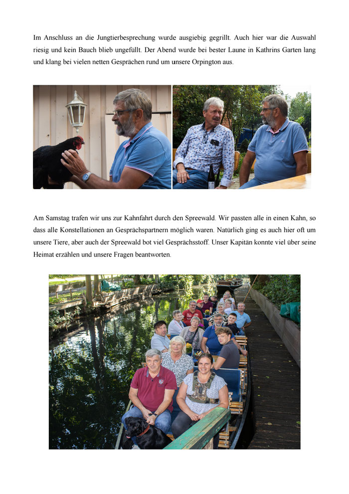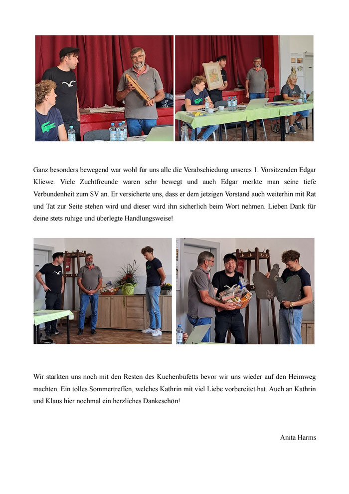 Abends trafen wir uns dann zum Züchterabend mit Büfett und Tombola im Pavillon des Hauses Düsse. Hier überreichte Edgar Kliewe die SV-Ehrenbänder an Reinhard Lawall auf 0.1 braun-porzellanfarbig und ein weiteres Band ging an die Zuchtgemeinschaft Marielle und Michael Kern auf 0.1 gelb-schwarzgesäumt. Diese waren nicht anwesend und bekamen ihr Band mitgebracht. Den Ulrich Jacob Martens Gedächtnispreis bekam wiederum Reinhard Lawall auf die braun-porzellanfarbigen Orpington.
